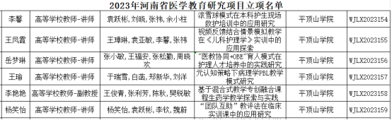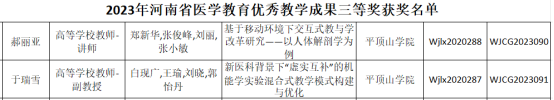 近日,河南省卫生健康委员会下发了《河南省卫生健康委关于公布2023年河南省医学教育研究项目立项教学成果和优质课评选结果的通知》(豫卫科教函〔2023〕41号),此次我院获批医学教育研究项目立项6项,结项13项;获评河南省医学教育优秀教学成果二等奖3项,三等奖2项;获评医学教育优质课教学二等奖1项。