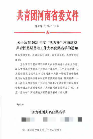 近日,由共青团河南省委员会主办的2024年度“活力杯”河南高校共青团基础工作大赛决赛在新乡举办。我院爱心医疗服务社在“活力社团”大赛中获得省赛三等奖。