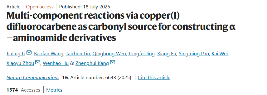近日,李玖零博士联合中国科学院上海药物研究所康正辉副研究员、台州学院周晓雨博士,在国际知名期刊《Nature Communications》上发表了题为“Multi-component reactions via copper(I) difluorocarbene as carbonyl source for constructing α-aminoamide derivatives”的研究论文。李玖零为论文第一作者,平顶山学院为第一通讯单位。