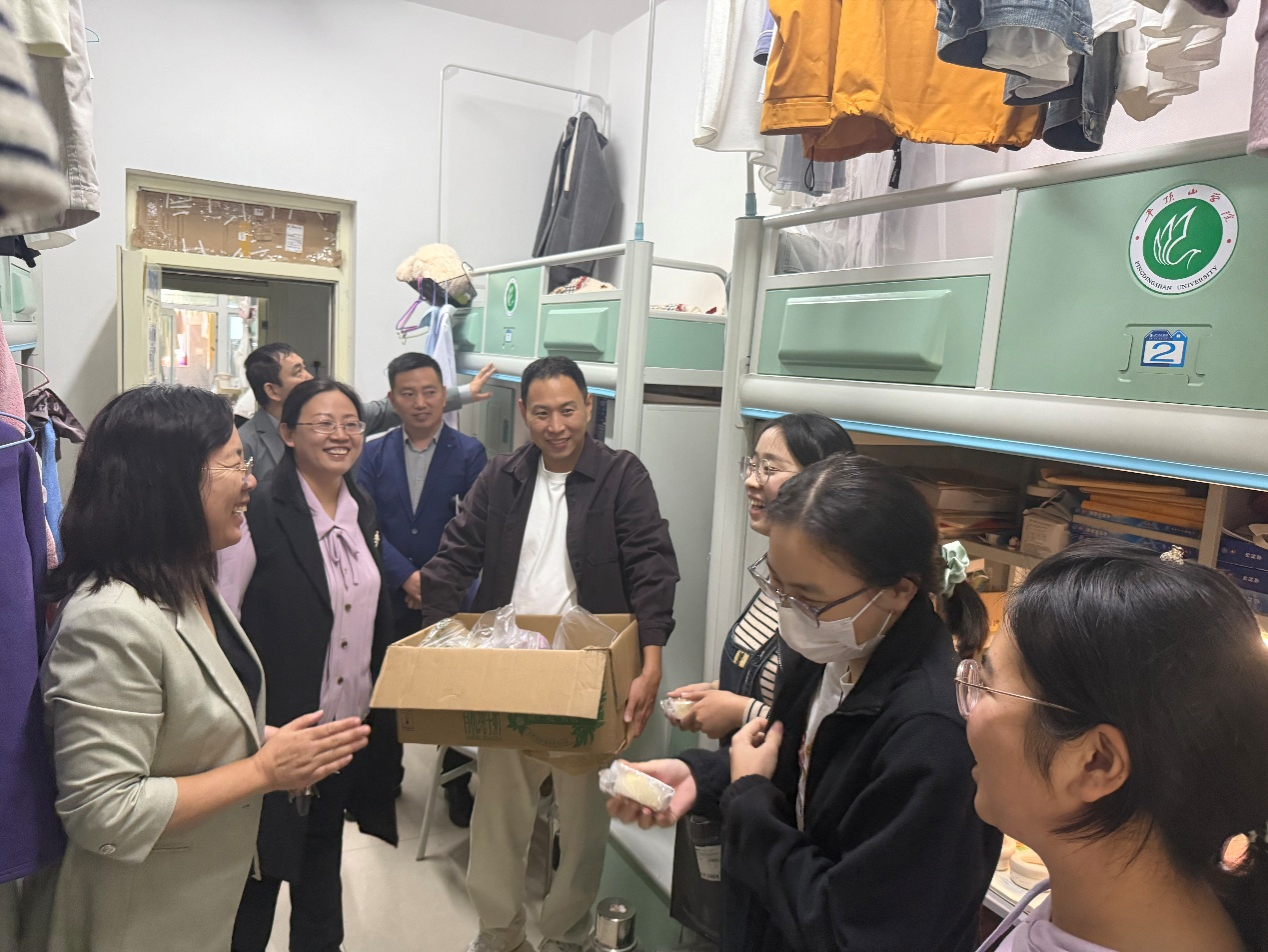 最后,学院领导班子前往湖滨校区,走进21、22级临床专业学生的宿舍分发月饼,详细了解同学们的留校生活与实际情况,并对宿舍安全状况进行了全面排查,确保大家能度过一个平安、祥和的假期。