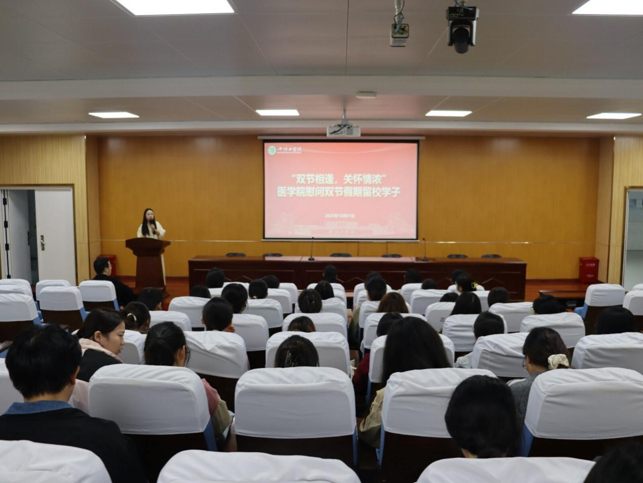 上午,1590巴黎人登录网址在崇文校区1、2号学术报告厅进行留校学生慰问座谈会及观影活动。我院党委书记王莉、院长郑新华、党委副书记夏乐、副院长高华山、副院长白现广,教师代表,及两百多名留校学生共同出席。1号学术报告厅里,针对留校备战考研的同学们,药学系张盼盼老师就考前复习策略、心理压力调整、应试技巧等方面进行指导,帮助同学们明确方向、稳定心态,以最佳状态迎接考试。随后,郑新华代表学院向同学们致以节日的问候,对同学们勤奋学习、刻苦钻研的精神表示肯定,并叮嘱同学们合理安排假期时间,夯实专业基础,成长为卓越医学人才。王莉叮嘱同学们在假期要注意人身与财产安全,学习的同时也要加强身心锻炼,拥有一个良好的体魄去迎接接下来的学习生活。2号学术报告厅中,夏乐强调了假期安全与学生未来职业规划,鼓励同学们多接触校园以外的生活,高华山则鼓励同学们在大学期间应主动走出校园,去感知广阔的世界,增长见识,全方位提升自己。活动后,学院向同学们分发月饼,送去节日的祝福。