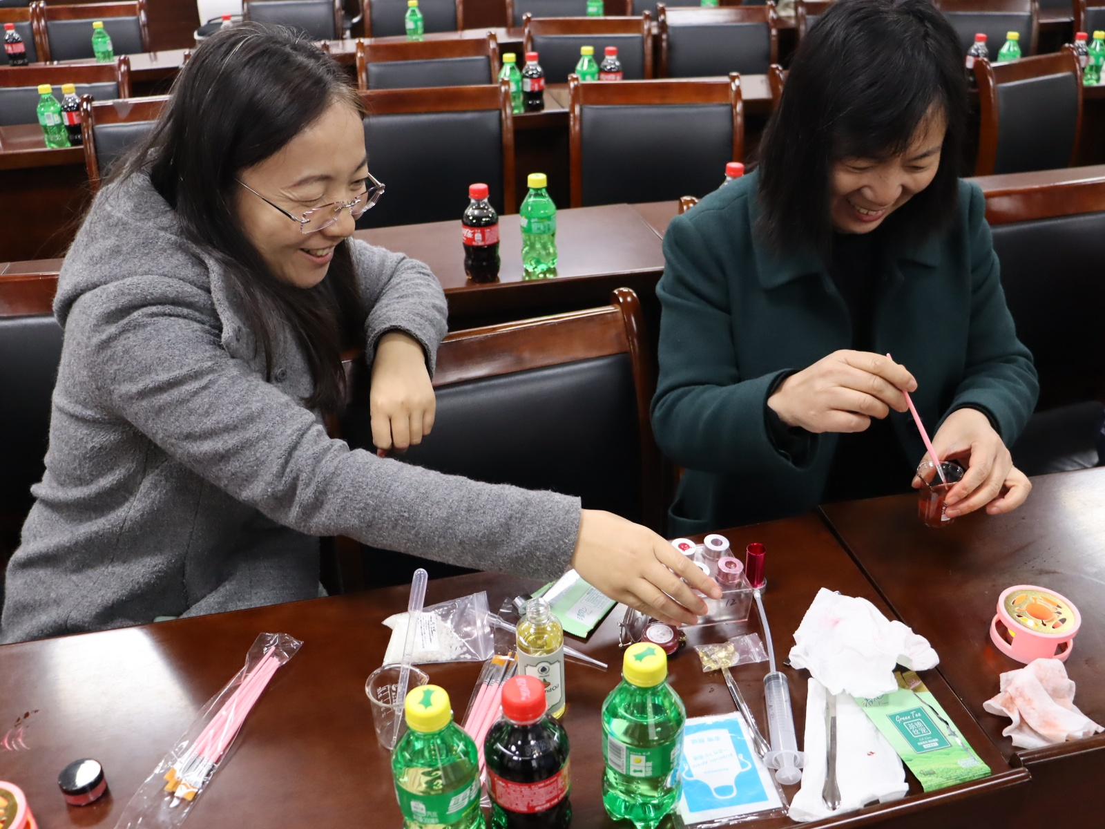 在手工口红DIY环节,来自医药科技协会的学生志愿者们担任指导老师,详细讲解了口红的制作步骤和技巧。女教职工们认真聆听,亲手调配原料、加热搅拌、灌装定型,体验从无到有的创作乐趣。经过精心制作,一支支色彩各异、精致温润的专属口红在大家手中诞生,现场气氛热烈,欢声笑语不断。