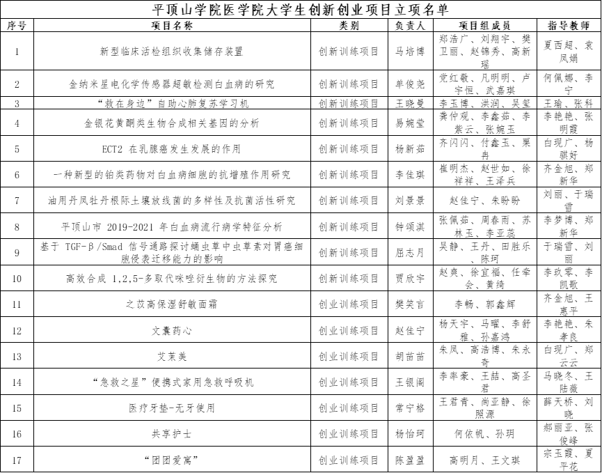 在刚刚公布的《2021年度平顶山学院大学生创新创业训练计划项目立项结果》中,全校共立项60项,其中1590巴黎人登录网址17个项目成功立项,立项数居全校首位,创我院历年新高。