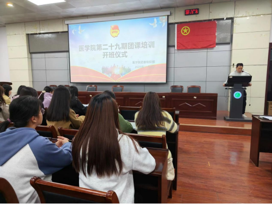 仪式伊始,主持人宣读培训纪律,全体起立共同奏唱共青团团歌。随后,夏乐老师进行了开班讲话并提出殷切期望。他指出,希望同学们作为新时期团员青年,要有责任感、使命感和紧迫感,不忘初心、坚定信仰,争做优秀共青团员。最后,夏乐老师以《认识共青团》为题进行了本期培训的第一讲。他分别从共青团基本概况、组织象征与标志等六个方面讲解了共青团的基本知识,并结合自己“三下乡”活动的实践经历,讲解积极参与社会实践活动的意义,鼓励各位团员积极参与到志愿服务、社会实践中去。