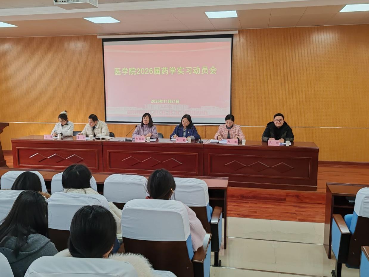 2025年11月21日,我院2026届药学专业毕业实习动员会在1号学术报告厅召开。我院党委书记王莉、院长郑新华、副书记夏乐、相关负责老师及26届药学专业实习生参加会议,实习办主任刘丽主持了会议。