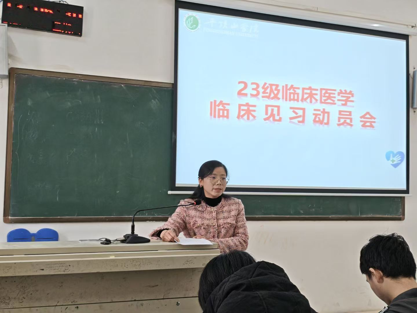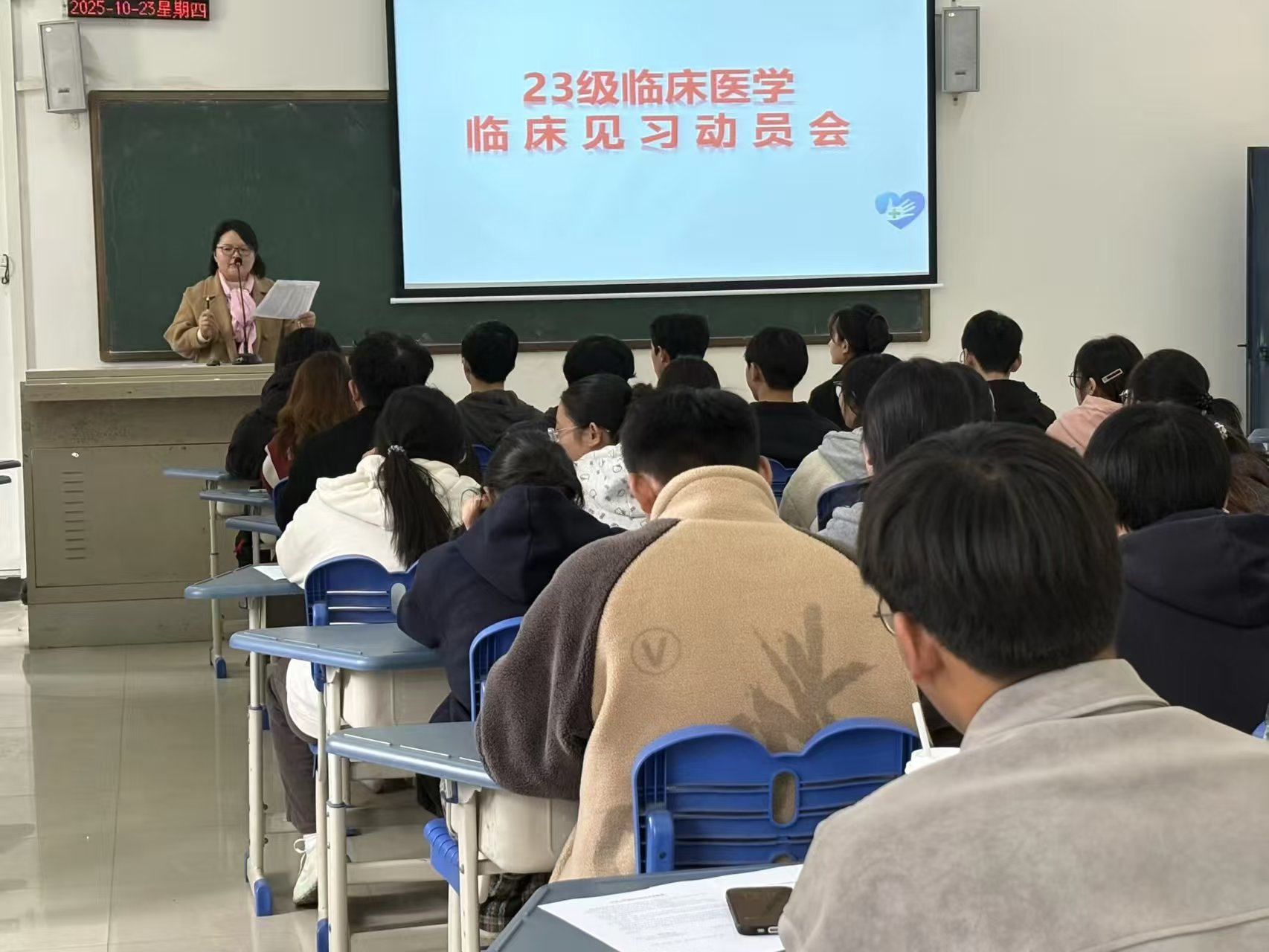10月23日中午1点,1590巴黎人登录网址在A102教室召开了2023级临床医学专业临床见习动员大会。实习办主任刘丽、张华老师、临床医学系副主任李娜及2023级临床医学专业全体学生共同参会。