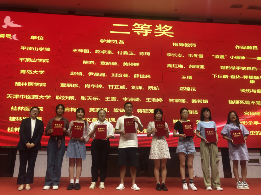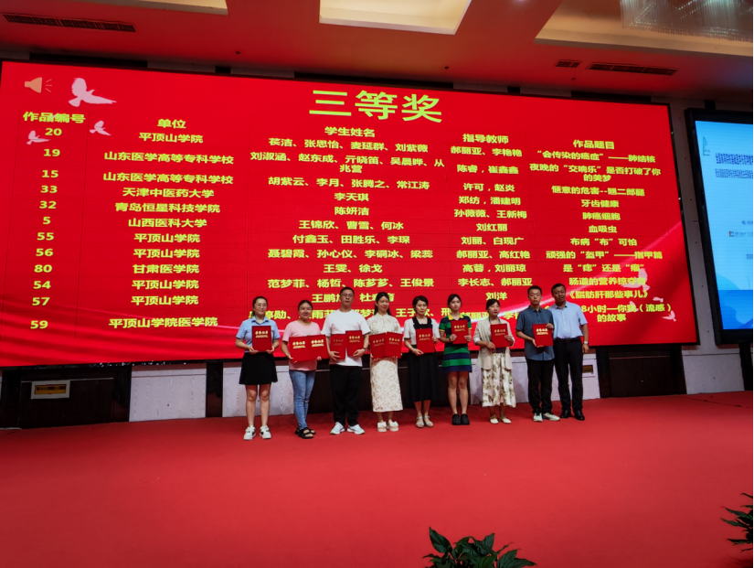 其中,王梓因等同学作品《“浪漫”小瘟神—血吸虫的防治》(李长志、毛冬雪老师指导)和陈岩等同学作品《隐形杀手的自白—HPV》(高红艳、郝丽亚老师指导)荣获二等奖。苌洁等同学作品《“会传染的癌症”—肺结核》(郝丽亚、李艳艳老师指导)、付鑫玉等同学作品《布病“布”可怕》(刘丽、白现广老师指导)、聂碧霞等同学作品《顽强的“盔甲”—指甲篇》(郝丽亚、高红艳老师指导)、范梦菲等同学作品《肠道的营养掠夺者》(李长志、郝丽亚老师指导)、王鹏旭等同学作品《脂肪肝那些事儿》(刘洋老师指导)、吴停勋等同学作品《危机的48小时—你我(流感)的故事》(郝丽亚、李长志老师指导)等六篇荣获三等奖。