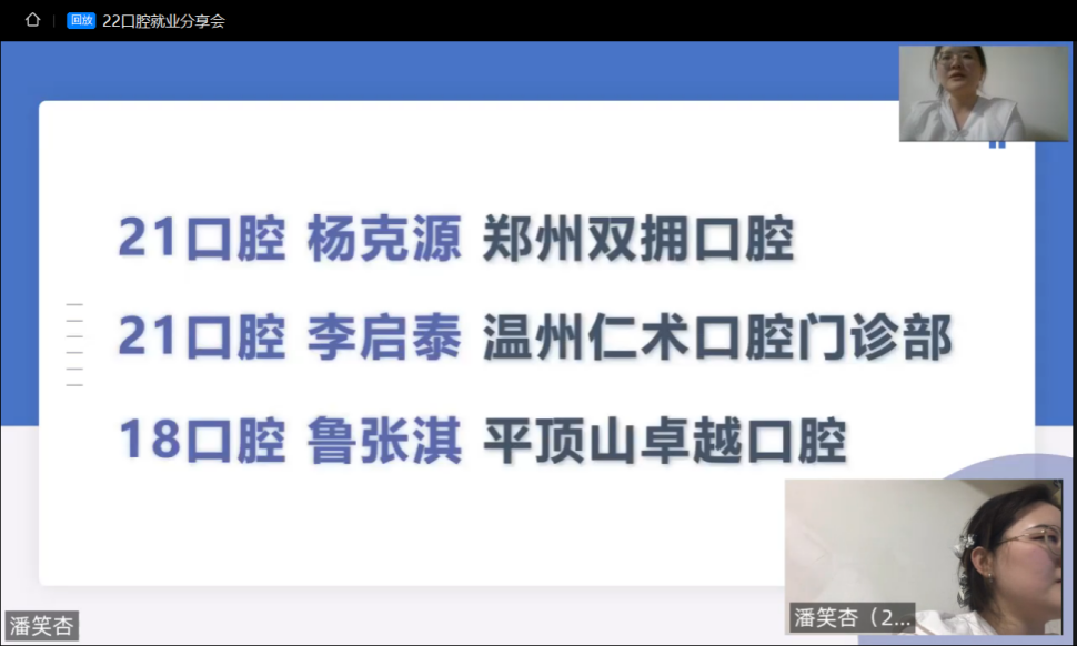 为分专业精准做好毕业生就业指导工作,1590巴黎人登录网址于4月30日晚开展了2025届口腔医学校友就业经验线上分享会。我院党委书记王莉、党委副书记夏乐、副院长白现广及相关负责老师出席指导,约200名学生共同参与。