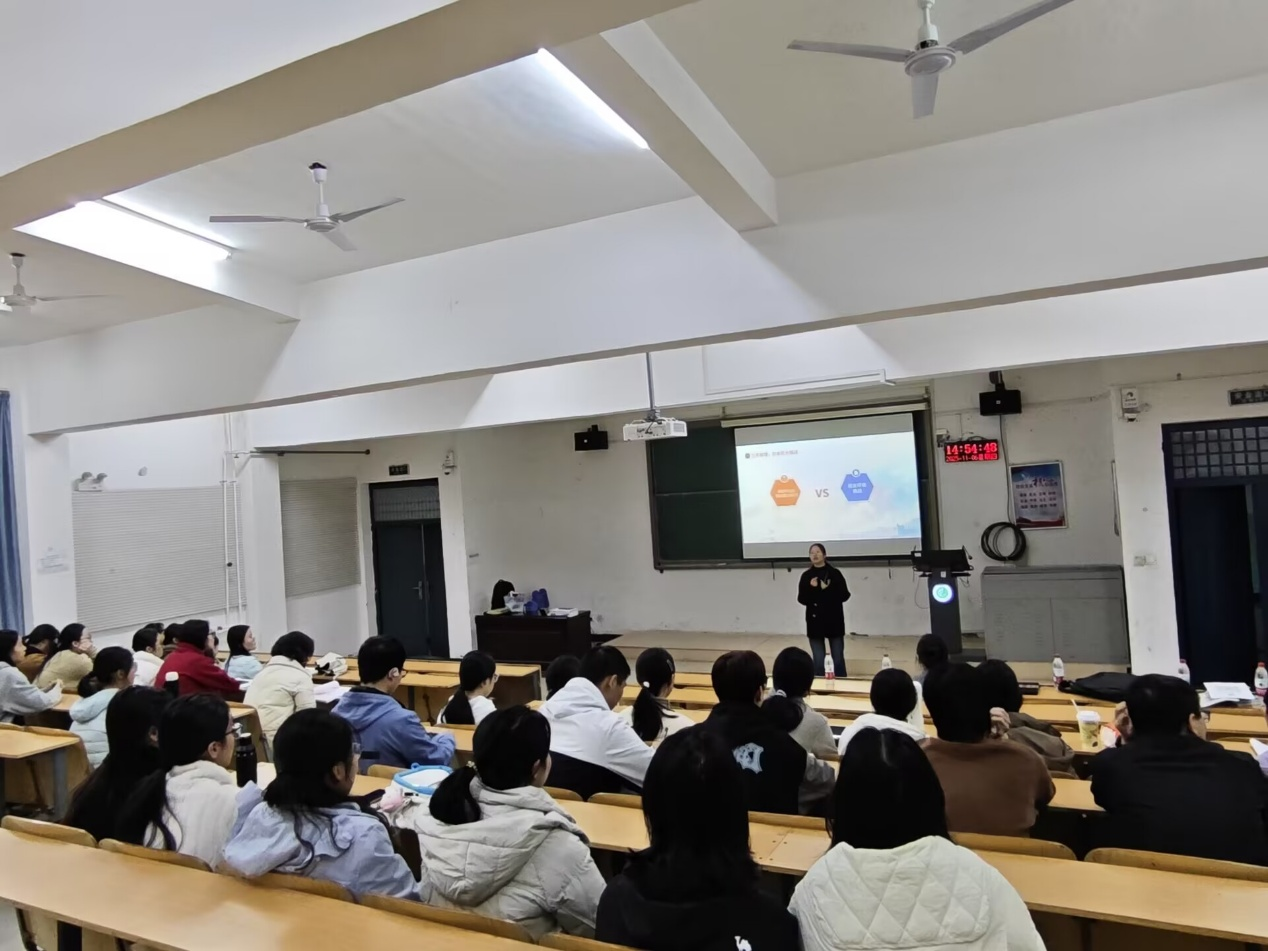 在宣讲环节,宋经理对药明津石企业发展做了详细讲解。药明津石聚焦生物医药领域,建立规范的CRC专项考核体系,确保服务质量与专业水准;同时推出人性化工作机制,充分赋予员工工作自主权。宋经理还分享了企业核心业务布局、行业资源优势及人才培养计划,重点介绍了针对高校毕业生的轮岗实训、导师带教等成长通道,让同学们直观感受到企业对青年人才的重视与赋能。